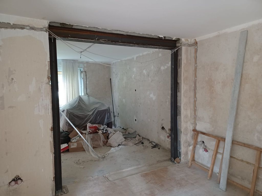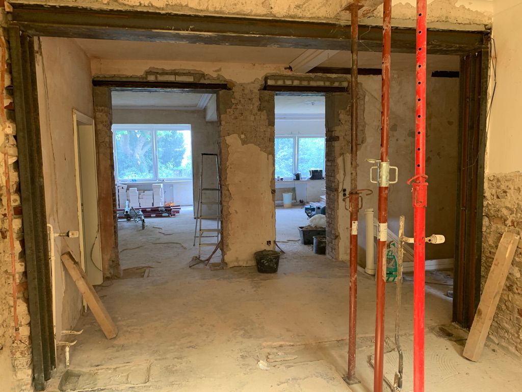 Als statischer Ersatz für den Wegfall der tragenden Wandkonstruktion wird, gemäß statischem Nachweis, eine Konstruktion aus Trägern (Profilstahl) und, falls erforderlich, mit Stützen (Profilstahl) oder Pfeilern (Stahlbeton / Mauerwerk) hergestellt.